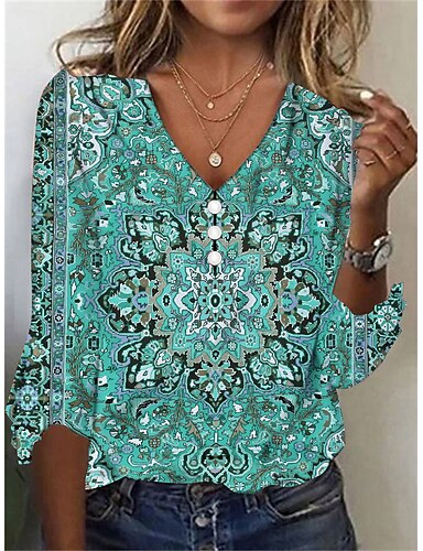 Femmes T-shirt Chemise Henley Fleuri Vintage Ethnique Quotidien Basique Manche 3/4 Col en V Hauts Réguliers Fête Week-end Boutons Imprimé Rouge Violet Vert Kaki Gris Automne & Hiver