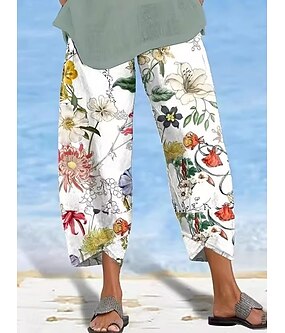 Femme Chino Vacances Rétro Vintage Mollet Taille haute Floral Poche Ceinture élastique Confortable Doux Micro-élastique Extérieur Vacances Blanche Eté Ample
