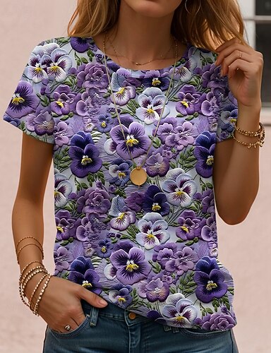 T-shirt pour femmes floral col rond à manches courtes impression 3D de papillons élégante décontractée confort_fit violet mult taille haut de mode