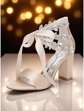 Sandales à talons carrés et bout ouvert ornées de cristaux en satin beige - Chaussures pour femmes pour mariage et cocktail