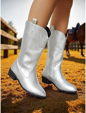 Bottes de cowboy western en denim bleu pour femmes avec détails brodés – bottes à bout pointu mi-mollet pour festivals de musique, événements de rodéo et tenues de style country