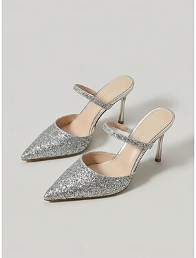 Sandales à talons hauts pailletées argentées pour femmes avec bride à la cheville, chaussures de soirée scintillantes pour les tenues de club et de soirée