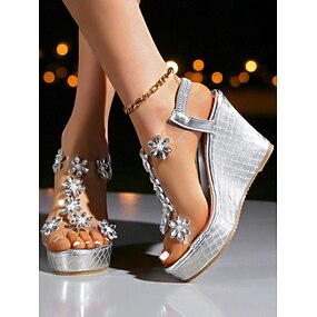 Sandales compensées argentées à strass pour femmes - Talons compensés à fleurs scintillantes avec bride à la cheville pour les soirées, les clubs et les événements en soirée