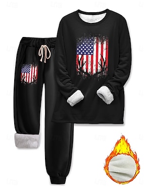 Ensemble de pyjamas pour femmes doublé en polaire 2 pièces sweatshirt survêtements pantalons en polaire manches longues col ras du cou graphique quotidien impression à cordon décontracté noir rouge