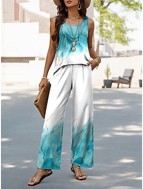 Ensemble de pantalons pour femmes vacances quotidiennes sans manches col en U graphique floral décontracté bleu violet vert été coupe régulière