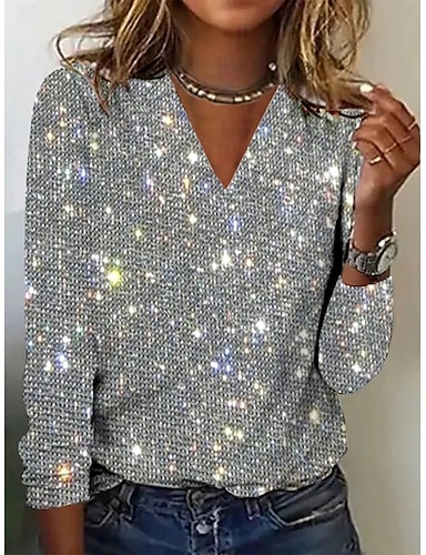 Noël Femmes Chemisier Couleur Unie Élégant Basique Occasionnel manche longue Col en V Hauts Réguliers Quotidien Paillettes Argent Noir Rouge Vert Printemps Automne Hiver