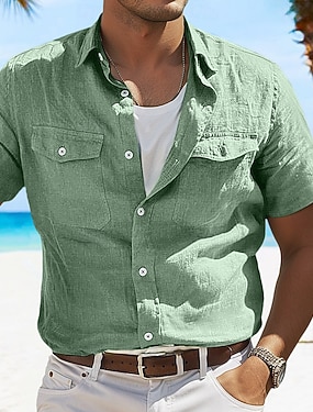 Homme Chemise Chemise en lin Chemise d'été Chemise de Plage Couleur Unie Vacances Croisière Vert Gris Claire Bleu clair Manche Courte Col rabattu Printemps & Été Vêtement Tenue Avec Poches