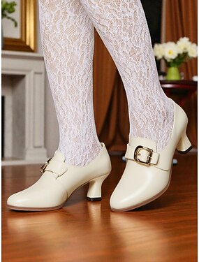 Chaussures à talons bas en similicuir beige verni, style vintage années 1950, avec nœud noir. Élégantes chaussures rétro chics d'inspiration édouardienne, parfaites pour les soirées et le quotidien.