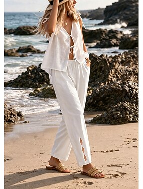 Femmes Grande taille Pantalon d'été 100% Coton Vacances Basique Décontracté Quotidien Longueur complète Taille haute Couleur Unie Cordon de serrage in in france they say Pontalon wide leg Confortable
