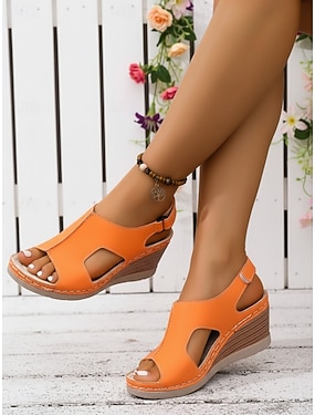 Sandales compensées orange pour femmes – sandales confortables à bout ouvert et bride arrière, avec découpes et semelle antidérapante rembourrée, chaussures d'été décontractées pour les voyages, le