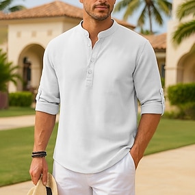 Homme Chemise Chemise Lin Chemise Col Cubain Chemise à col officier Chemisette Chemise d'été Tenues de plage Vacances Curise Noir Blanche Rose Claire Bleu manche longue Col Mao Printemps été Vêtement
