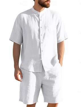 Homme Chemise en lin Deux pièces Ensemble Chemise Et Shorts Shorts en Lin Shorts de plage Set Uni Quotidien Extérieur Plage Col grand-père Manche Courte Été Mode Occasionnel Confortable Vêtement Tenue