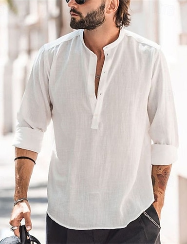Homme Chemise Chemise en lin Chemise à col officier Chemise popover Chemise d'été Tenue de plage Uni Vacances Rue Noir Blanche Vert Claire Bleu clair manche longue Col montant Été Printemps Vêtement