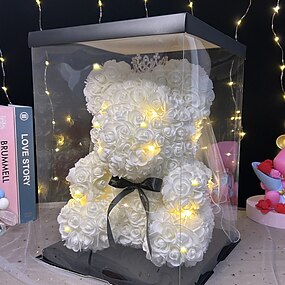 Ours en roses artificielles en mousse avec lumière LED et boîte cadeau en plastique - cadeau romantique parfait pour la fête des mères, un anniversaire, un mariage, Thanksgiving et Noël 25 cm/10 pouces
