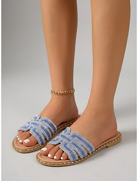 Femmes Vacances Station balnéaire en plein air Été Strass Perlage Talon plat Bout Rond Bohème Vacances Faux Cuir Mocassin Bleu Marron