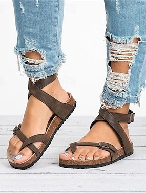 sandales plates à lanières marron pour femmes – semelle en liège confortable avec boucle réglable, chaussures de plage d'été décontractées