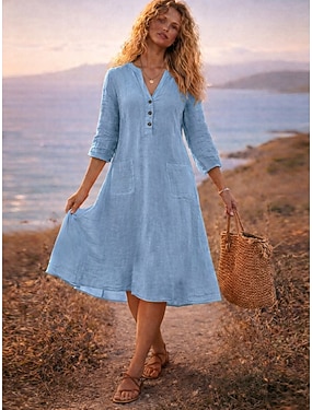 Femmes Robe Midi Faux coton lin Robe Chemise Robe Décontractée Classique Moderne Extérieur Vacances Fête Coupe régulière Uni manche longue Col en V Noir Violet Orange Bleu clair Automne