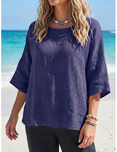 Femmes Chemisier Uni Occasionnel Manche 3/4 Col ras du cou Hauts Réguliers Quotidien Fête Sortir Bleu Jaune Rose Claire Gris Été Printemps