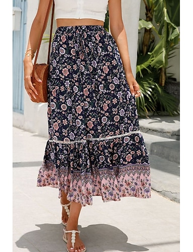 Femmes Jupe de vacances Élégant Bohème Mode Occasionnel Midi Taille Basse Jupes Graphique Paisley Cordon de serrage Taille Élastique Ourlet irrégulier Non Elastique Quotidien Vacances Bleu Noir