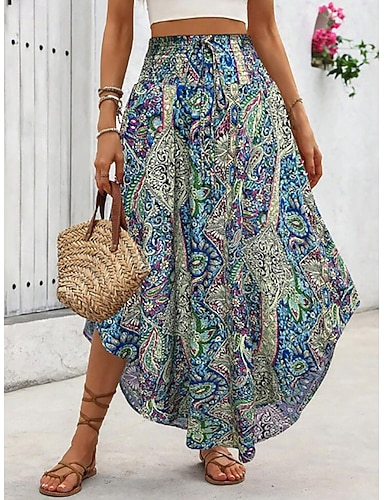 Femmes Jupe de vacances Élégant Bohème Mode Occasionnel Midi Taille Basse Jupes Graphique Paisley Cordon de serrage Taille Élastique Ourlet irrégulier Non Elastique Quotidien Vacances Bleu Noir