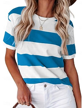 Femmes T-shirt Imprimé Graphique Rayé ancien Élégant Occasionnel Manche Courte Col ras du cou Hauts Réguliers Quotidien Week-end Bleu Noir Bleu Poudré Orange Vert Été Printemps