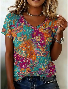 Carnaval Femmes T-shirt Imprimé Graphique Abstrait ancien Occasionnel Manche Courte Col en V Hauts Réguliers Quotidien Week-end Vêtements de vacances Bleu Été Printemps