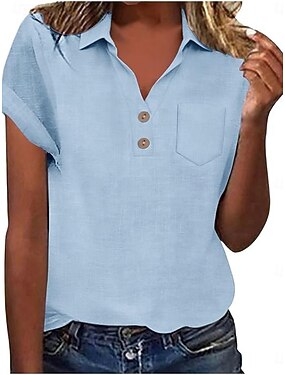 Femmes T-shirt Boutons Uni Mode Élégant Classique Manche Courte Col ras du cou Hauts Réguliers Quotidien Sortir Week-end Bleu Noir Rose Claire Kaki Gris Été Printemps