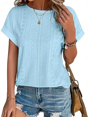 Femmes T-shirt Œillet Uni Mode Élégant Classique Manche Courte Col ras du cou Hauts Réguliers Quotidien Sortir Week-end Bleu Noir Blanche Vin Orange Été Printemps