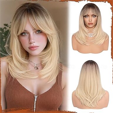 perruques blondes pour femmes perruque blonde claire ombrée avec frange perruque synthétique mi-longue en couches racines foncées cheveux pour fête quotidienne