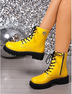 Bottines de combat jaunes à lacets pour femmes – Bottines à plateforme épaisses et audacieuses avec fermeture éclair latérale, style streetwear punk pour l'automne et l'hiver