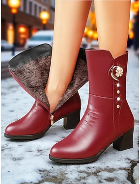 Bottes d'hiver mi-mollet rouges à boucle pour femmes – doublure douce et chaude, style festif de Noël, idéales pour un look urbain hivernal, les photos de vacances et les célébrations saisonnières.