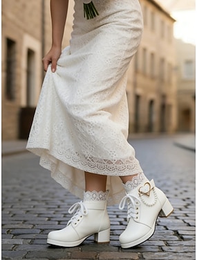 bottines de mariée blanches pour femmes – chaussures de mariage à lacets avec décoration en cœur et perles, talon épais pour les mariées d'inspiration vintage