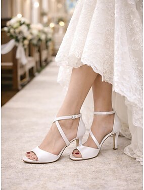 Escarpins de mariée blancs en satin pour femme – chaussures de mariage à talons aiguilles, bout ouvert et brides croisées, pour la mariée