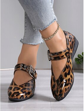 Femmes Chaussures plates Chaussures de confort Quotidien Boucle Talon plat Bout Pointu Occasionnel Faux Cuir Lanière de cheville Vin Léopard Noir