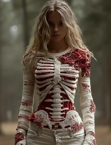 Femmes Pull Mignon Streetwear Occasionnel Graphique Squelette Col ras du cou Patchwork Tricoté manche longue Hauts Réguliers Tricoter Halloween Noir Rouge Automne Hiver