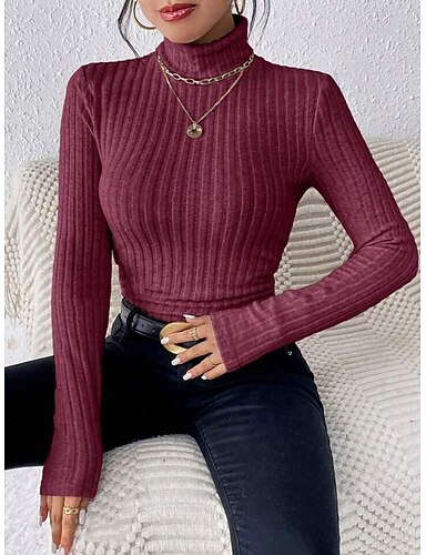 Femmes Pull Occasionnel Doux Couleur Unie Côtelé Col roulé Tricoté manche longue Hauts Réguliers Tricoter Extérieur Quotidien Week-end Noir Vin Automne Hiver