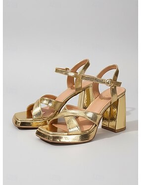Sandales compensées dorées métallisées glamour pour femmes - élégantes sandales à talons hauts carrés avec bride cheville, parfaites pour les vacances de luxe, les soirées et les mariages.