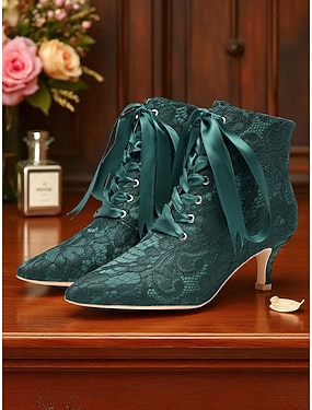 Bottines à lacets vertes pour femmes avec ruban de satin et talon chaton - bottes habillées de style victorien vintage pour dames, parfaites pour les mariages, les soirées Gatsby &événements officiels