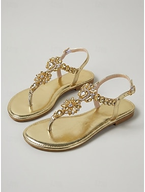 Sandales plates dorées à cristaux pour femmes, chaussures de soirée à bout ouvert et bride en T pour dîner à l'hôtel ou vacances &événements estivaux en soirée