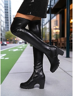 Bottes noires à talons épais en similicuir au-dessus du genou pour femmes - bottes hautes extensibles élégantes pour le streetwear d'automne-hiver, les fêtes et les sorties nocturnes