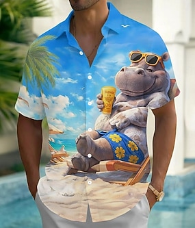 Homme Animal Girafe Hippopotame Chemise hawaïenne Chemise Boutonnée Chemise Aloha Manche Courte Hawaïen Vacances Tenue de plage Été Printemps Col Rabattu Impression 3D chemises à col Bleu Bleu 1#
