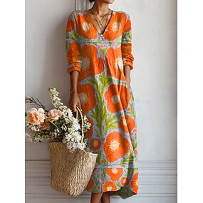 Robe Maxi Femme Lin Comme Respirant Léger Robe d'Été Robe Lâche Casual Fête Vacances Ajustement Régulier Imprimé Floral Manches Longues Col V Bleu Jaune Rouge Orange Été Printemps