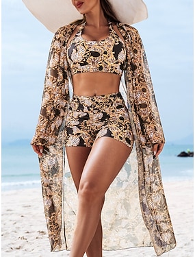 Bikini pour femmes 3 pièces maillot de bain shorts taille basse dos nu vacances plage graphique floral col halter sans manches