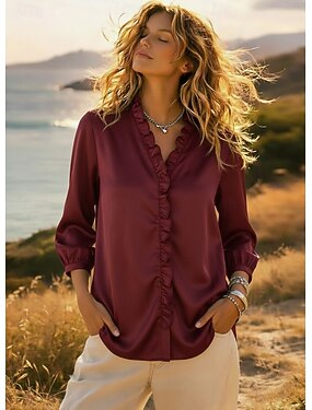 Femmes Chemise Chemisier A Volants Patchwork Uni Élégant Classique Moderne Manche 3/4 Col en V Hauts Réguliers Quotidien Fête Sortir Noir Vin Bleu Ciel Violet Bleu de minuit Été Printemps