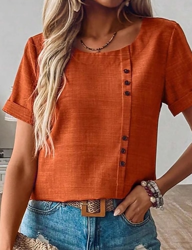 Femmes Chemise d'été Chemise Décontractée Chemisier Froncé Boutons Couleur Unie Uni Quotidien Élégant Occasionnel Manche Courte Col ras du cou Hauts Réguliers Fête Tenue de plage Vêtements de vacances