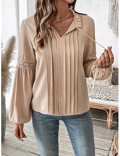 Femmes Chemise Couleur Unie Uni ancien Élégant manche longue Col en V Hauts Réguliers Quotidien Extérieur Vêtements de rue Bleu Noir Vert Kaki Été Printemps Automne