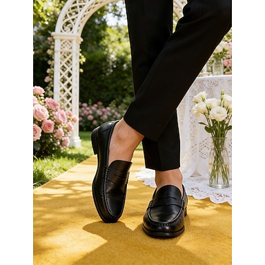 Mocassins noirs haut de gamme pour homme, style classique avec boucle, idéaux pour les événements formels et les mariages.