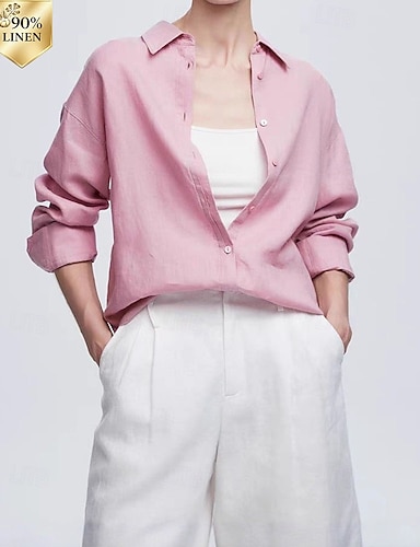Femmes Chemises en coton et lin Chemisier Boutons Uni Élégant manche longue Col de chemise Hauts Réguliers Quotidien Travail Fête Bleu Blanche Rose Claire Printemps Automne