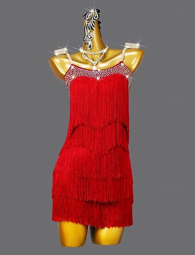Danse Latine Robe Strass Perles Gland Femmes Performance Entraînement Sans manches Spandex