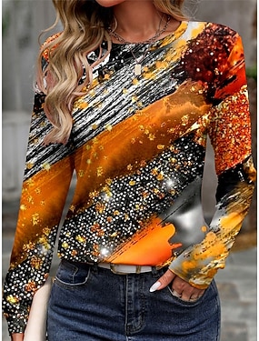 T-shirt Pour Femmes Manches Longues Col Ras Du Cou Tunique Décontractée Imprimé Hauts Réguliers Quotidiens Orange Printemps Automne Préautomne